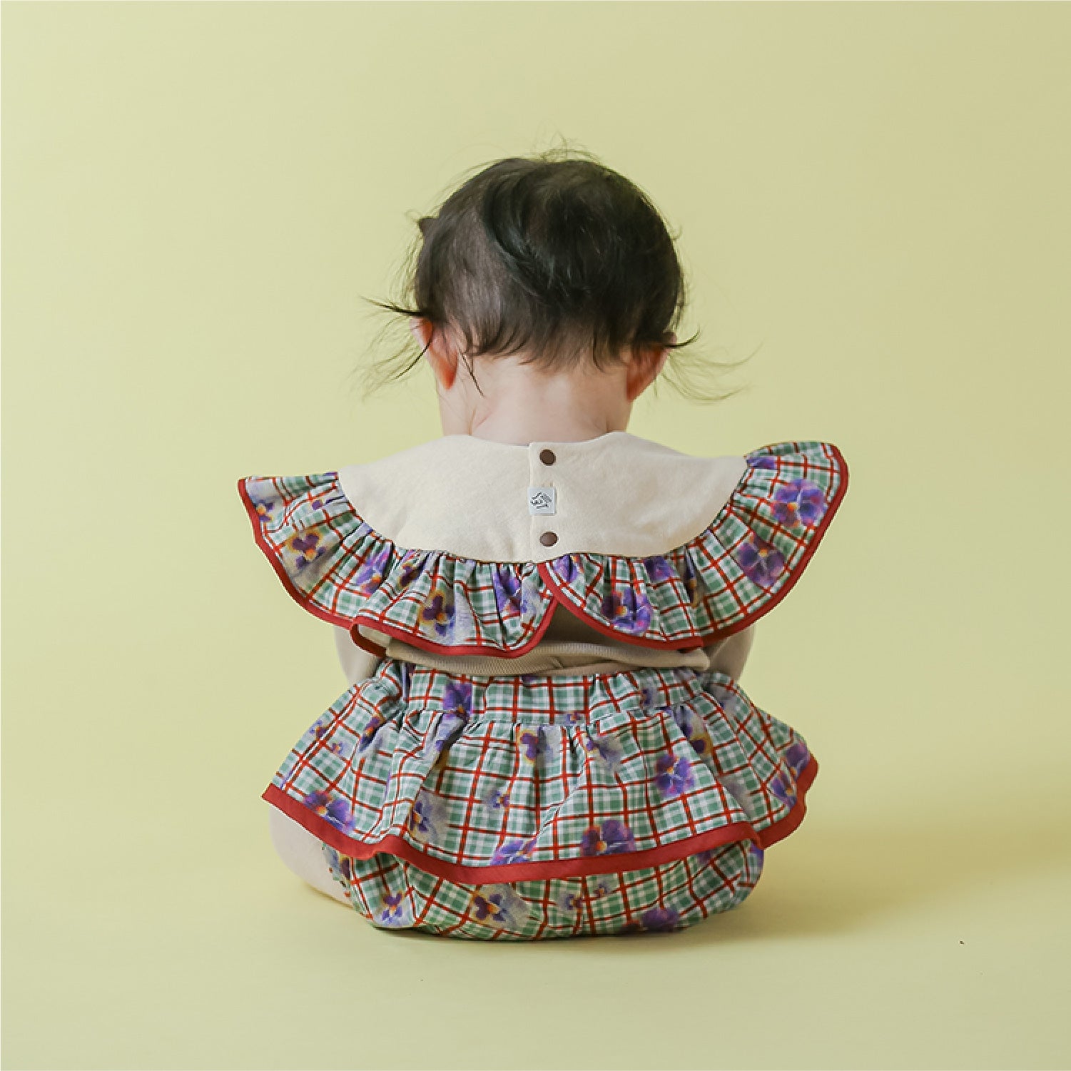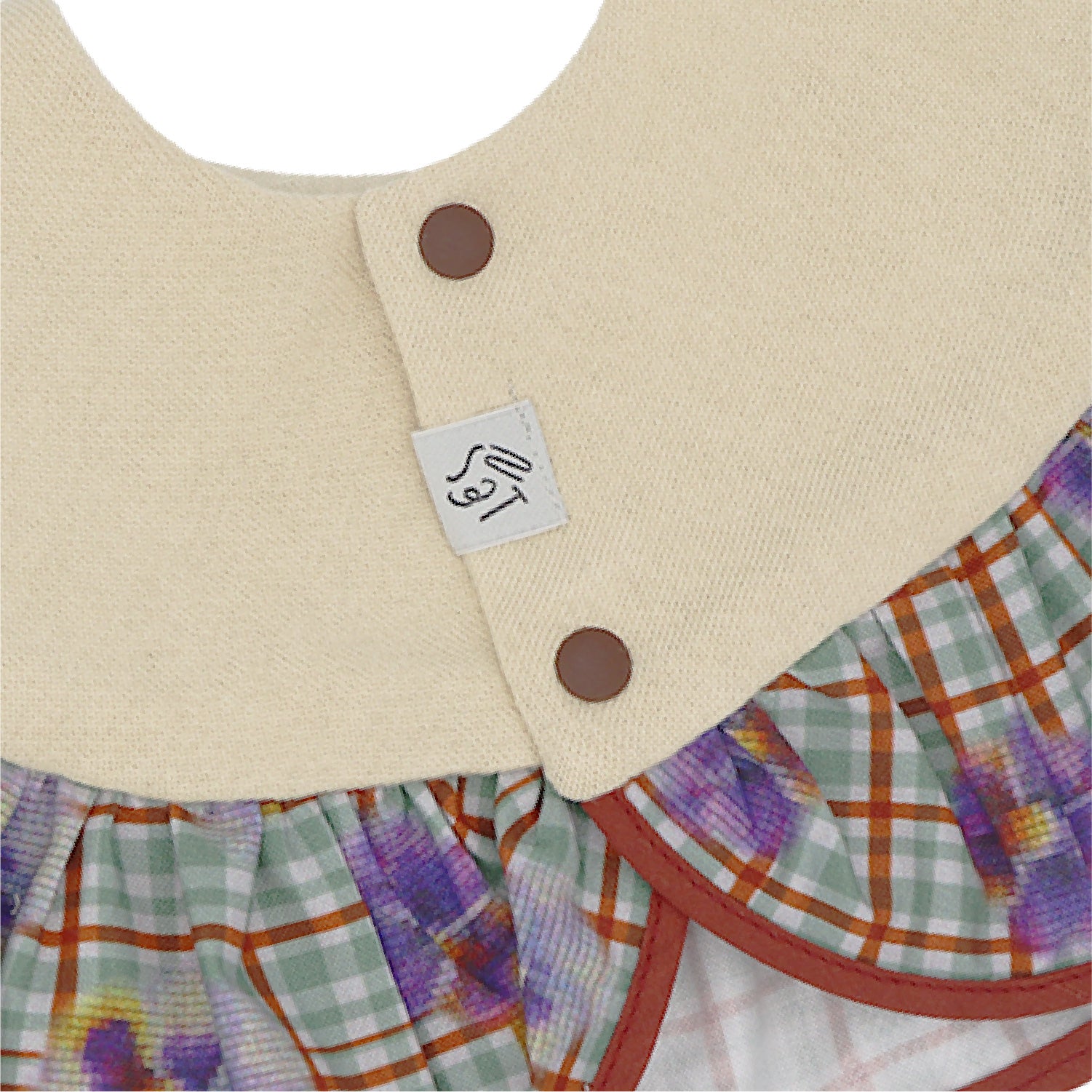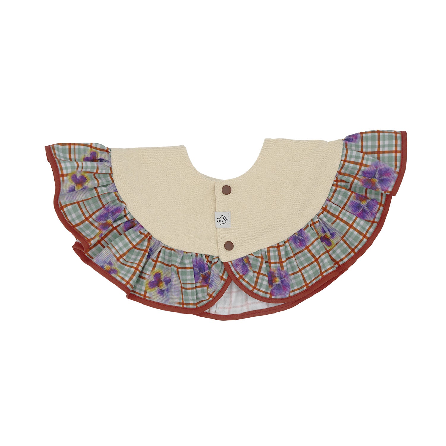 1枚で主役級。贅沢に生地を使った、大ぶりのフリルが特徴の「フリルスタイ」です。プチギフトにもおすすめ!同じ柄のブルマ / フリルブルマと合わせれば、セットアップに。